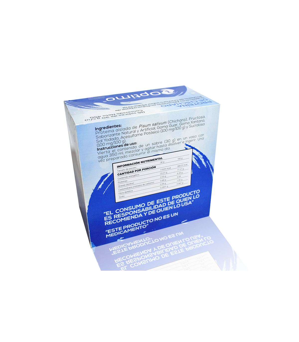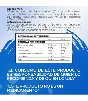 Proteína aislada de chícharo. fructuosa cristalina, saborizante natural y artificial, goma guar, goma xantana, sal, acesulfame de potasio, sucralosa.